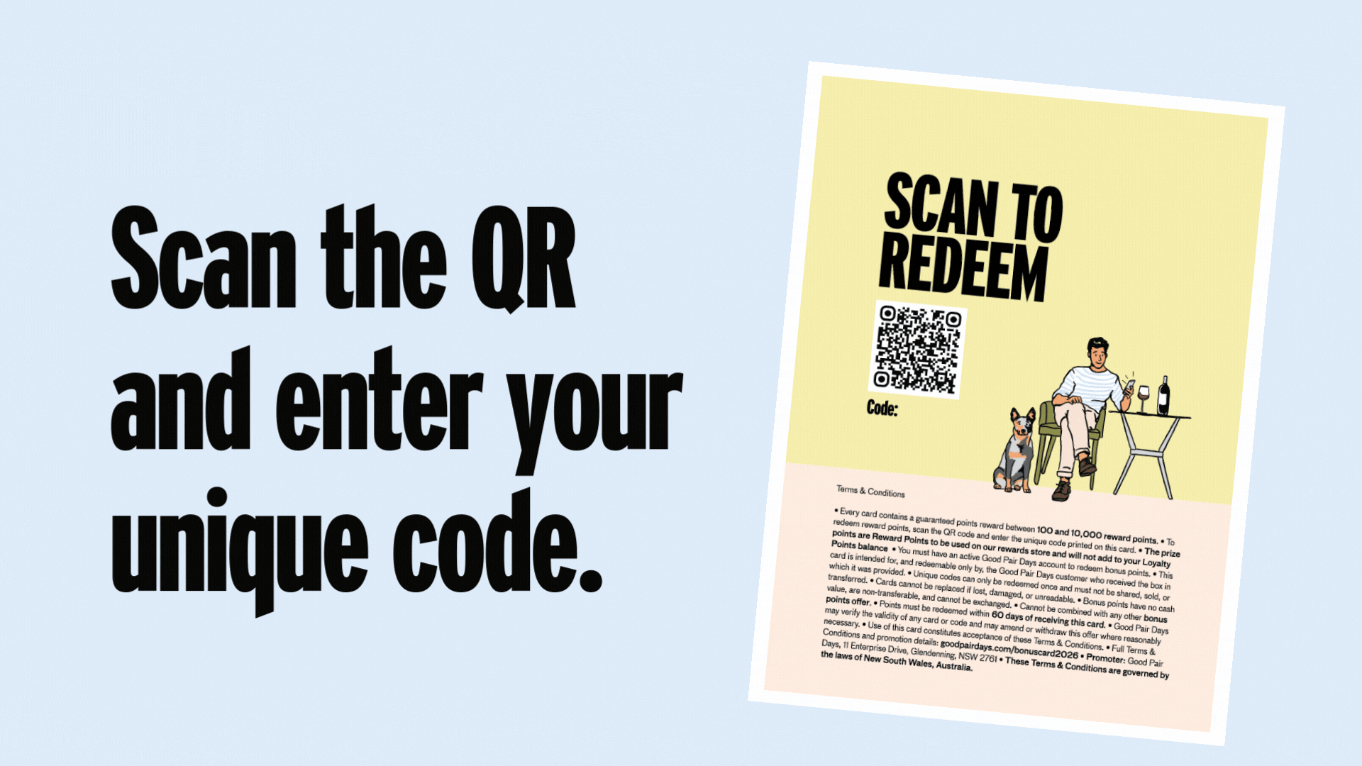 To redeem, scan the QR code on the card and enter the unique code printed on the card. Points are applied to the customer’s Good Pair Days account after successful redemption.